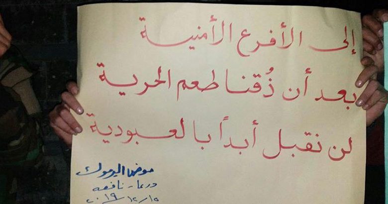 كما رفع المحتجون لافتاتٍ تشير إلى أنهم لن يرضخوا إلى سلطة النظام أو سياساته، بحسب الصور التي نشرها “أحرار حوران” على صفحته الرسمية في “فيس بوك”.
