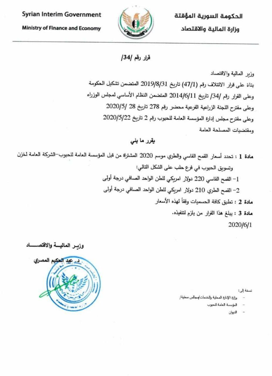 وقالت وزارة المالية والاقتصاد في الحكومة السورية المؤقتة في بيان اليوم، 3 من حزيران، إن مؤسسة الحبوب التابعة لها ستشتري القمح القاسي من المزارعين بمبلغ 220 دولار للطن الواحد، و210 دولارات بالنسبة لطن القمح الطري.