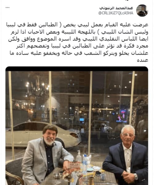وأرفق الزنتوتي الصورة بتعليقٍ قال فيه: “عرضت عليه القيام بعملٍ ليبي يخص الملمعين للحاشية “الطبالين”، من أجل فضحهم وكف أذاهم عن الآخرين وجعلهم يتنفسون بحرّية، وسيتم عرض المسلسل باللهجة الليبية وإذا لزم الأمر أيضاً باللباس التقليدي الليبي”، حسب وصفه.