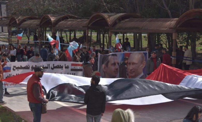 وأخرج نظام الأسد طلاب جامعة البعث في حمص في مسيرة مؤيدة لروسيا في احتفاء لافت في غزوها لأوكرانيا، رفع خلالها الطلاب صور الرئيس الروسي فلاديمير بوتين إلى جانب صور بشار الأسد بحسب ما أوردته وسائل إعلامه