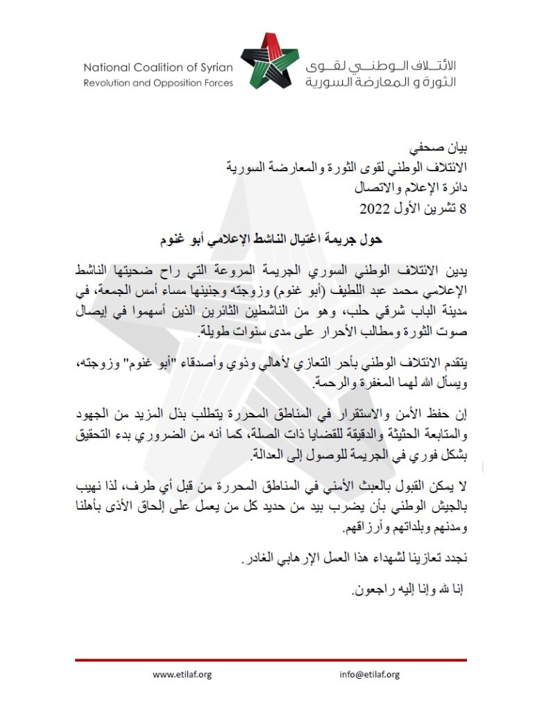 وأدان البيان “الجريمة المروعة التي راح ضحيتها الناشط الإعلامي محمد عبد اللطيف (أبو غنوم) وزوجته وجنينها مساء الجمعة، في مدينة الباب شرقي حلب، وهو من الناشطين الثائرين الذين أسهموا في إيصال صوت الثورة ومطالب الأحرار على مدى سنوات طويلة”.