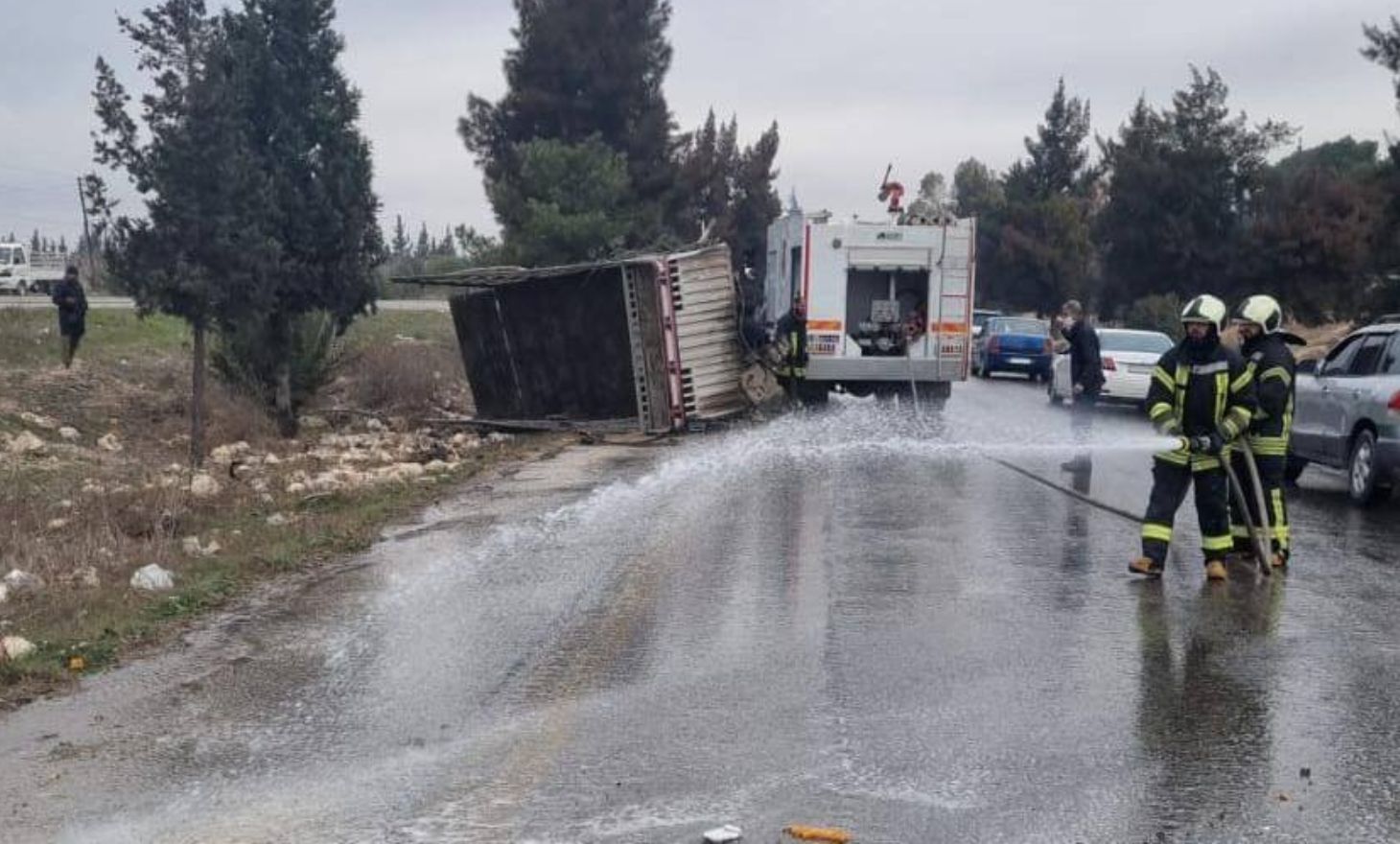 وذكر الدفاع المدني أن شاحنة محملة بالدجاج خرجت عن مسارها واصطدمت في منصف الطريق وشاحنة أخرى، مما أدى إلى احتراقها وتدميرها.
